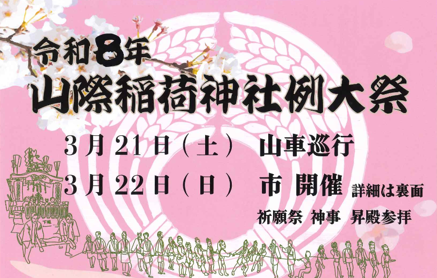 初日の21日は、午後1時からお稲荷様を飾った山車がお囃子を敲き(たたき)ながら町内を巡行、途中区堺や要所で五穀豊穣等のお祓いを行いながら町内を練り歩きます。(今の山車になったのは昭和20年代です。)稲荷神は元来、五穀豊穣を司る神であったが、時代が下って、商売繁昌・産業興隆(こうりゅう)・家内安全・交...