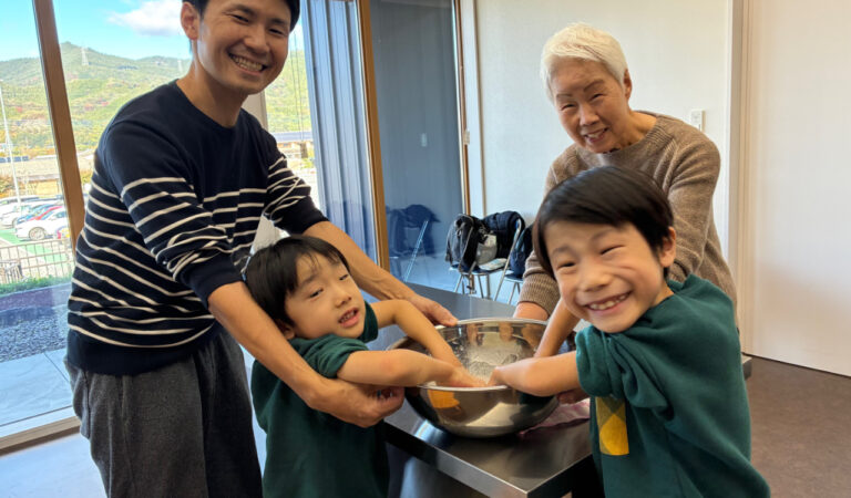 ご家族で一つのものを作り上げる楽しく素敵な時間です。 パパの大きな手がこんにゃくを練り上げるのに大活躍です。 とても弾力のある美味しそうなこんにゃくに仕上がりました。