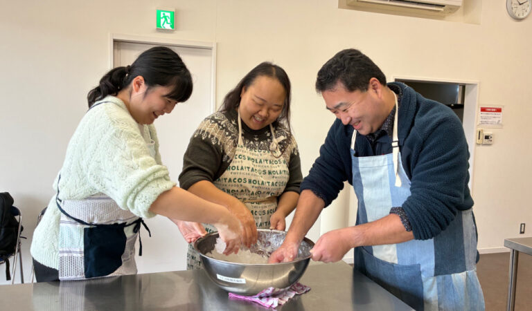 初めて触るこんにゃくに最初は戸惑いつつも途中からは慣れた手つきで練っていました。さすが高校生、スムーズに作業が進みました。出来上がったこんにゃくは旅行のお土産話と一緒にご家族と味わっていただけたら嬉し...