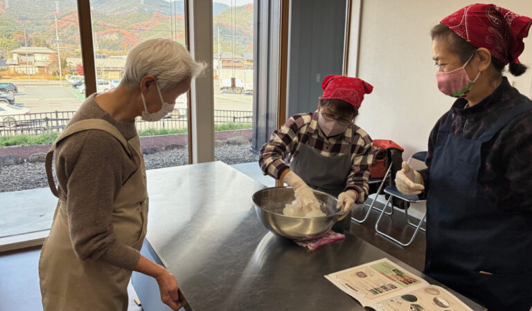 高校時代の同級生6人組で体験にご参加です。 2組に分かれて体験したところ、練り方の違いで完成したこんにゃくにも違いが生まれビックリ! 40年来の付き合いということもあり、息ぴったりの作業で素敵なお土産が出来ました。