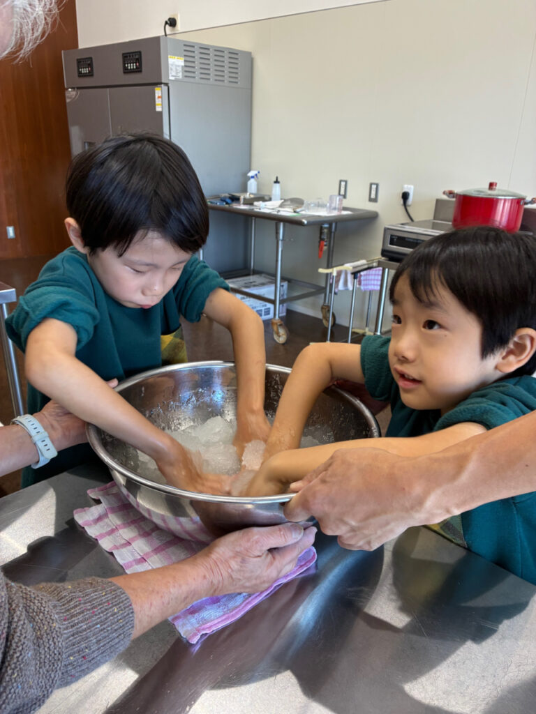 ご姉弟で仲良くこんにゃく作りに挑戦。 こんにゃくを作るだけではなく、漢字の学習タイムもあります。 ご両親は「こんにゃく」漢字が分からない、お子様は「蒟蒻」の漢字をイメージ出来ました! 蒟蒻ゼリー...
