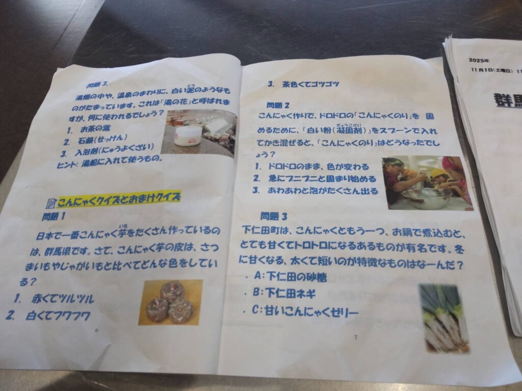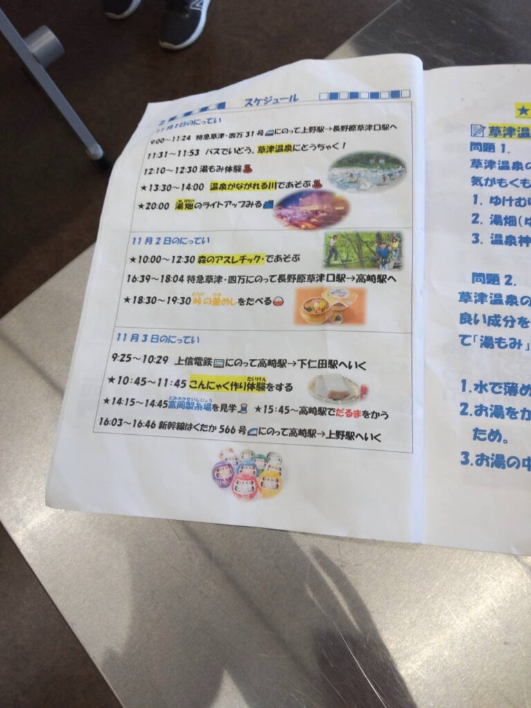 お父様手作り「旅のしおり」そして、こんにゃくの事前学習まで完璧です。 お母様はカメラマン、記録係に徹します。 草津温泉から下仁田まで電車の旅を満喫。 親子でこんにゃくが大好き!念願のこんにゃく手作りに挑戦、真心こもったこんにゃくに仕上がりました。 担当スタッフは、心温まる家族旅行でご両親の優しさに大感激でした。