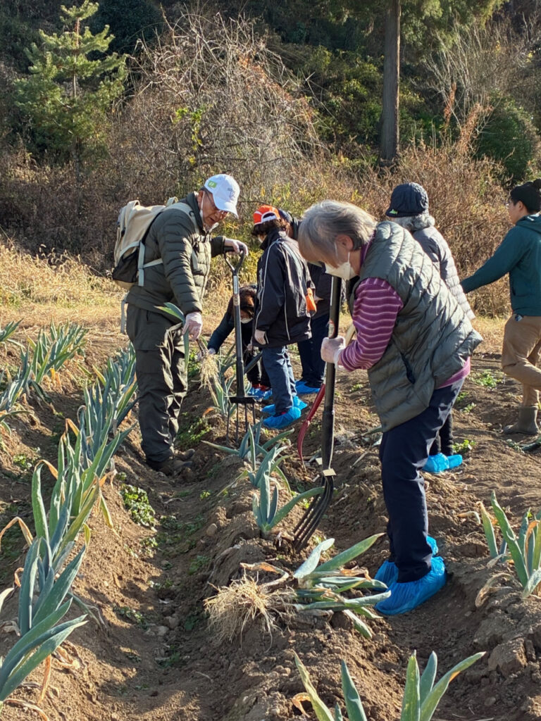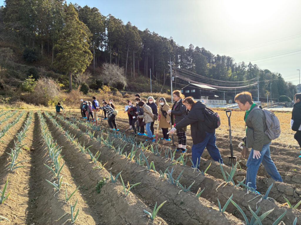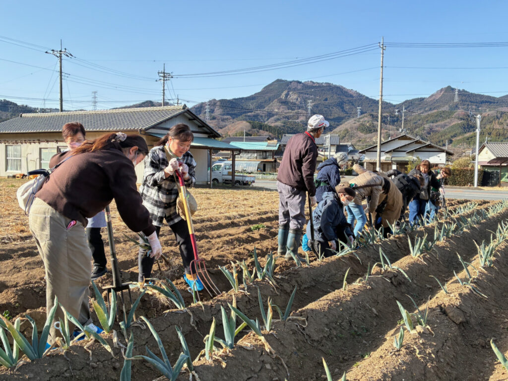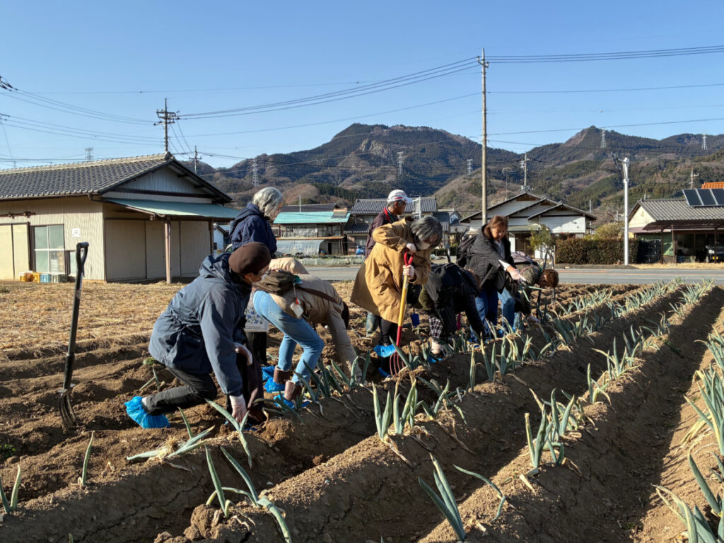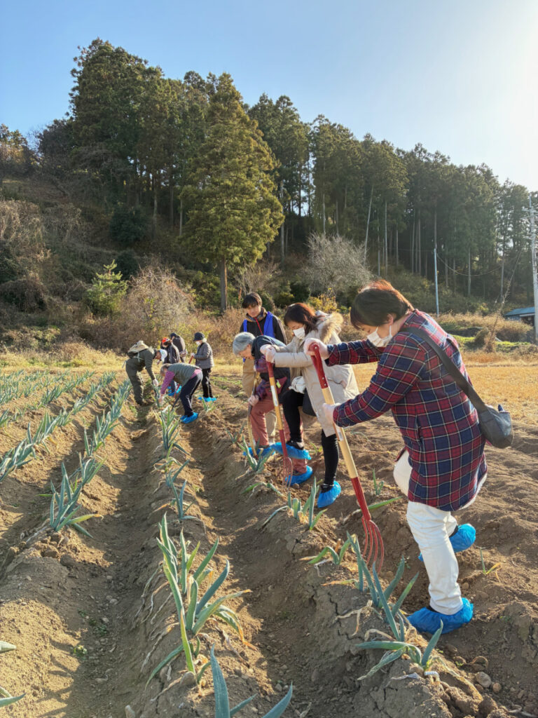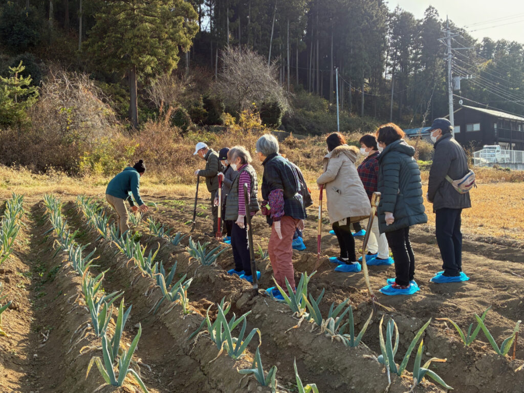 いよいよ収穫スタート!寒さを吹き飛ばすように、皆さんで気合を入れて「しもにた!ねぎー」と力強い掛け声!その勢いで、寒さも忘れて収穫作業に夢中になる、活気あふれる時間となりました。
