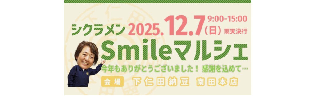 12月7日(日)、下仁田納豆南田本店にて『シクラメン Smile マルシェ』を開催します! 今回もたくさんのお店が集まります。シクラメンの販売もあります!