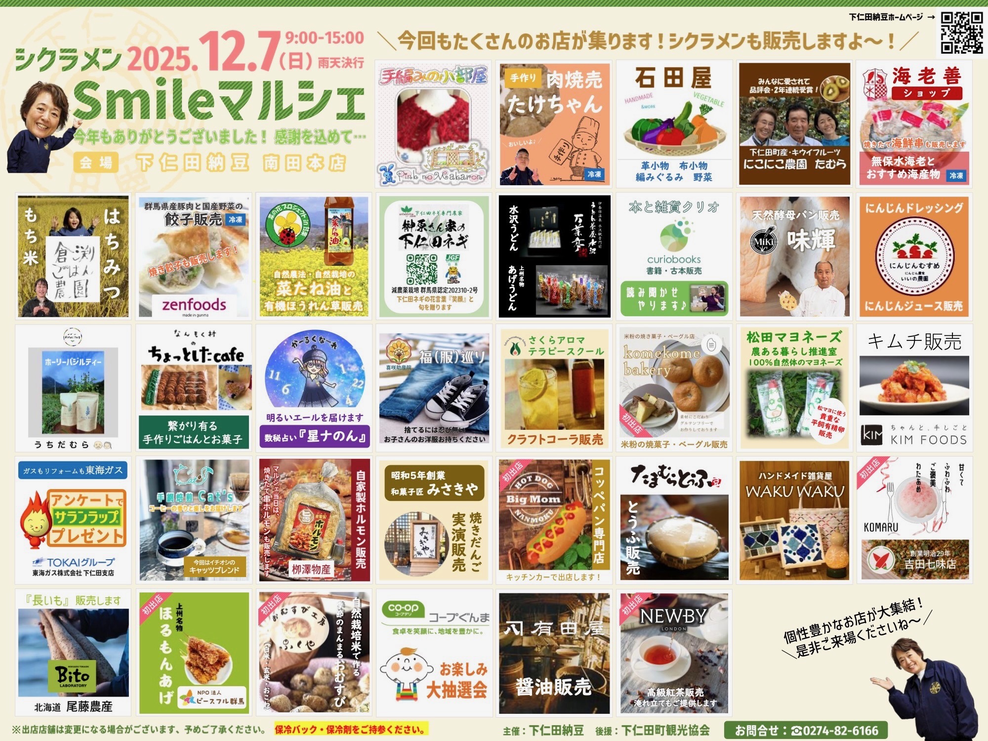 12月7日(日)、今回もたくさんのお店が集まります。シクラメンの販売もあります! 冬本番となりましたが、個性豊かなお店が暖かく皆さまをお迎えします。 週末はぜひ下仁田町にお越しください。